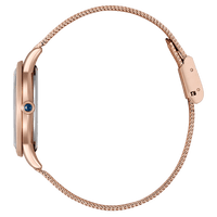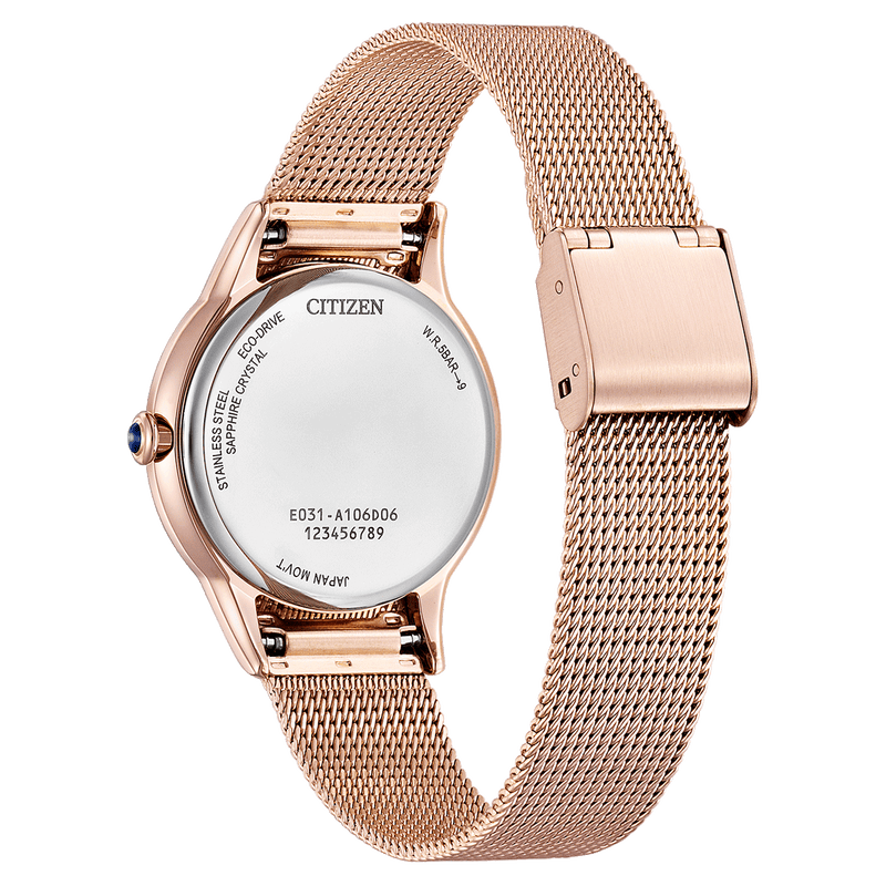 De EM1153-88A is vervaardigd uit verguld roestvrij staal en voorzien van krasbestendig saffierglas. Het Eco-Drive uurwerk biedt een gangreserve van 180 dagen en heeft een nauwkeurigheid van +/- 15 seconden per maand. De waterbestendigheid van 5 Bar maakt het horloge geschikt voor dagelijks gebruik, zoals handen wassen. De comfortabele Milanese band voegt een moderne, luxueuze uitstraling toe aan dit verfijnde ontwerp.