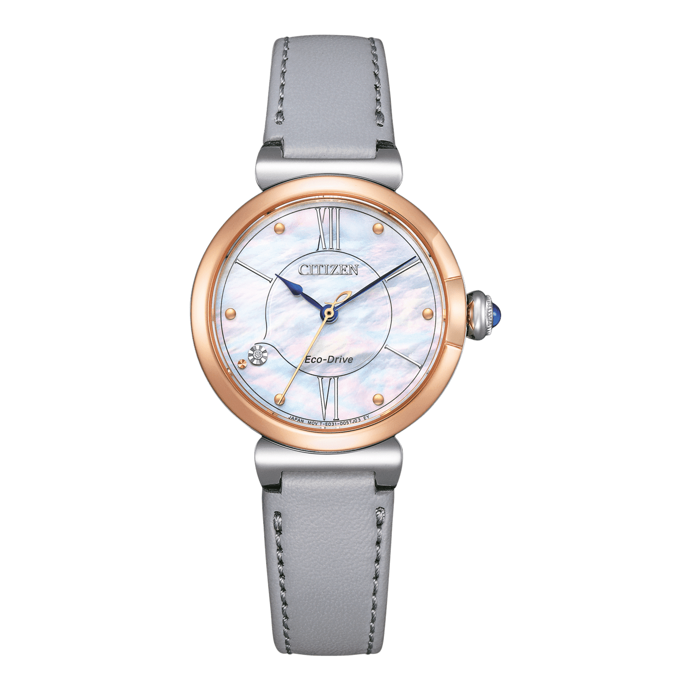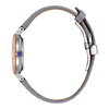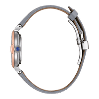 Met een parelmoeren wijzerplaat en blauwe wijzers biedt dit horloge een prachtige, vrouwelijke uitstraling. De kast is vervaardigd uit roestvrij staal met een bicolor roségouden afwerking, wat het horloge een luxueuze uitstraling geeft. De grijze band is gemaakt van Ecopet®, een synthetisch leer geproduceerd uit gerecyclede PET-flessen, wat duurzaamheid toevoegt aan het elegante ontwerp.