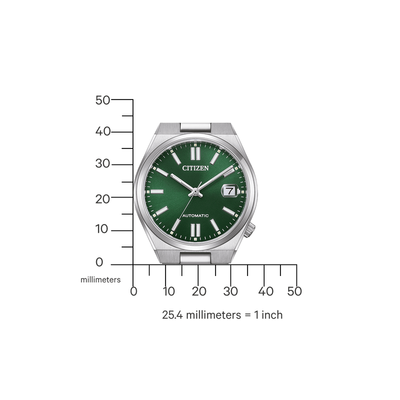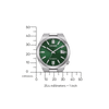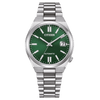 De Citizen Tsuyosa NJ0200-50X is een stijlvol mechanisch herenhorloge dat moderne elegantie combineert met robuuste techniek. De groene wijzerplaat springt direct in het oog en vormt een verfijnd contrast met de zilverkleurige kast en band. Dankzij het automatische kaliber 8210-P21 met een gangreserve van 42 uur en een nauwkeurigheid van ±20 seconden per dag, is dit horloge niet alleen een esthetische keuze, maar ook een betrouwbare metgezel voor elke dag.