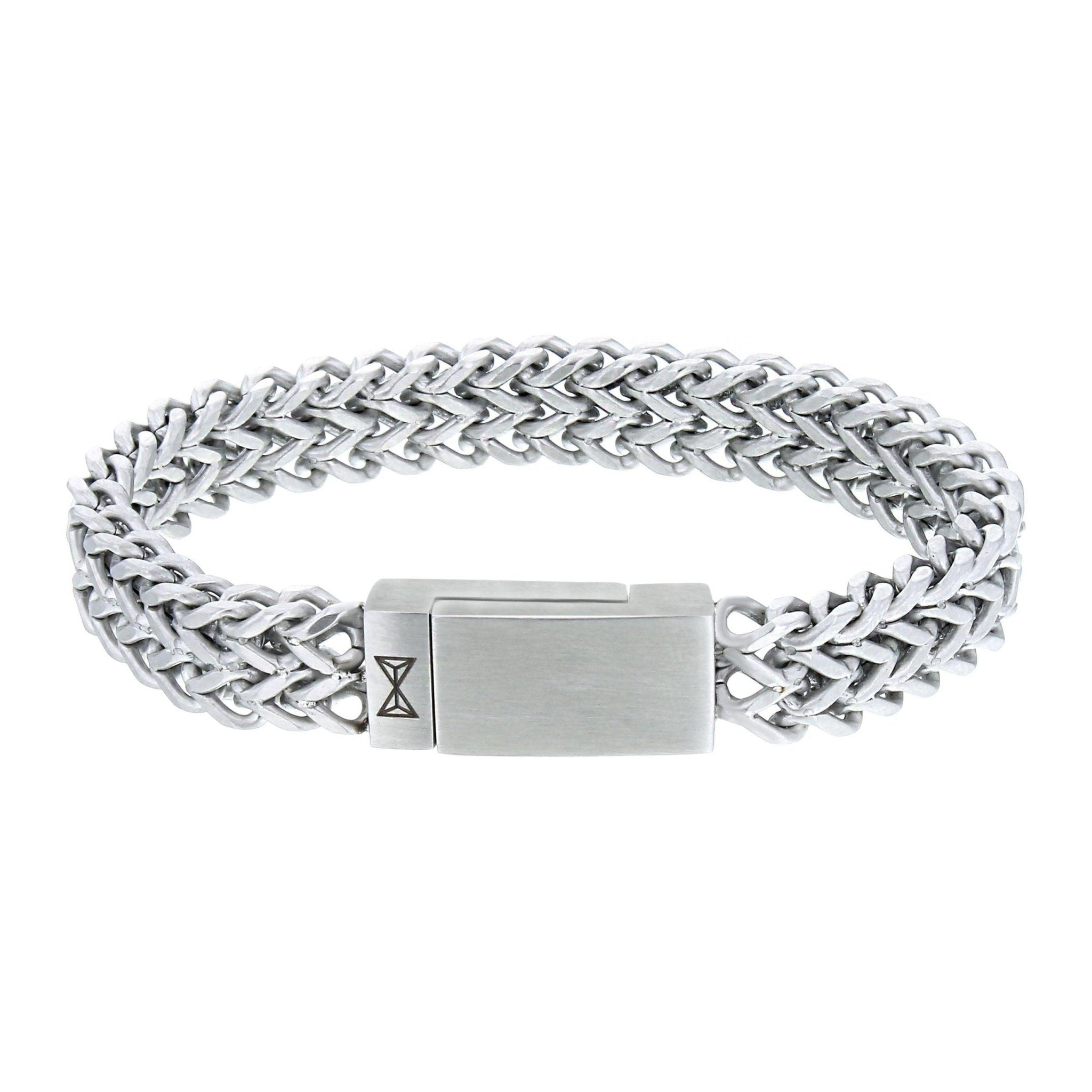 Deze dubbele schakelarmband is gemaakt van hoogwaardig 316L staal met een zilverkleurige gepolijste look. De armband heeft dikke gesloten schakels en een robuuste sluiting.
