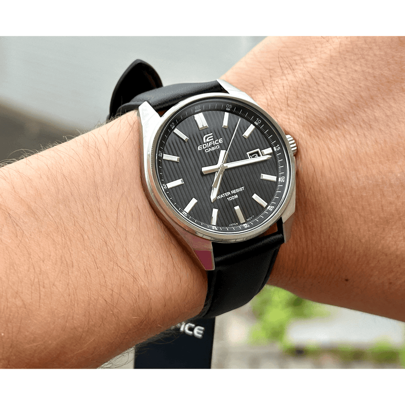 De Casio Edifice EFV-150L-1AVUEF is voorzien van analoge tijdsaanduiding met drie wijzers voor uur, minuut en seconde, wat zorgt voor een overzichtelijke en duidelijke weergave. Het horloge heeft een datumfunctie en biedt nauwkeurigheid tot ± 20 seconden per maand. De leren band zorgt voor een comfortabele pasvorm, en de waterbestendigheid tot 10 bar maakt dit horloge perfect voor dagelijks gebruik, ook bij activiteiten in het water.