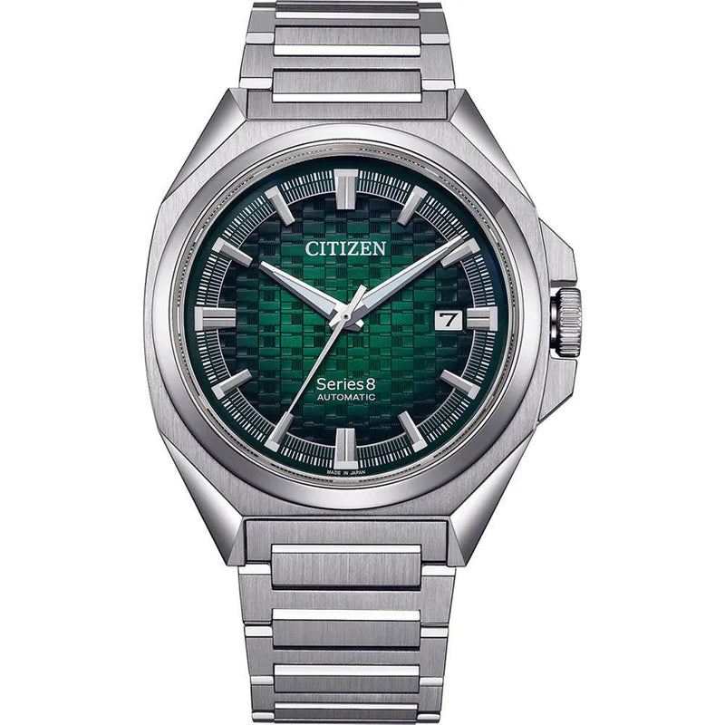 De Citizen Series 8 NB6050-51W is een verfijnde toevoeging aan de Series 8-collectie van Citizen, een horloge dat moeiteloos elegantie combineert met betrouwbare techniek. Dit model, uit de lente/zomercollectie van 2024, straalt luxe uit met zijn groene wijzerplaat en zilverkleurige wijzers. De kast van roestvrij staal, met een diameter van 40.8 mm en een kastdikte van slechts 10 mm, zorgt ervoor dat het horloge niet alleen prachtig om de pols zit, maar ook comfortabel aanvoelt.
