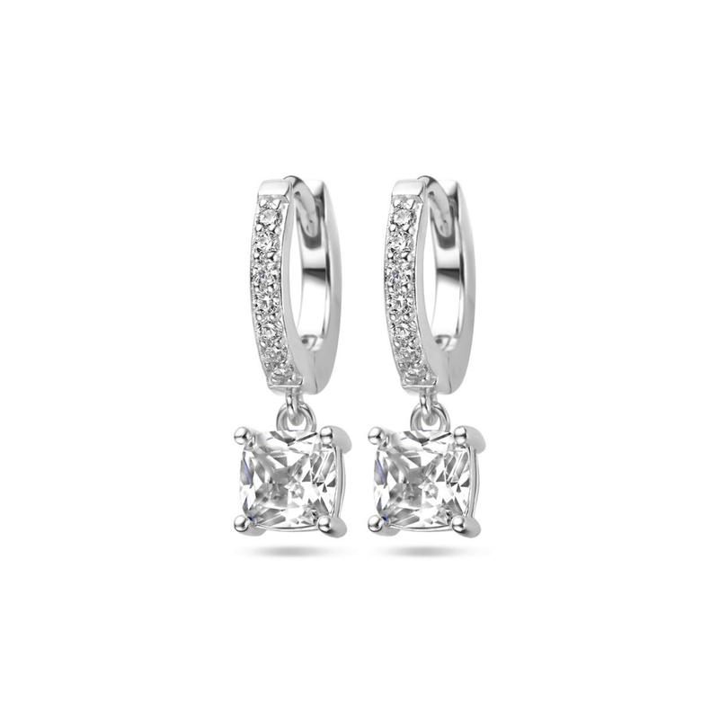 Gerhodineerd 925 zilveren klapoorringen uitgevoerd met zirkonia. De oorringen hebben een totale hoogte van 17mm.