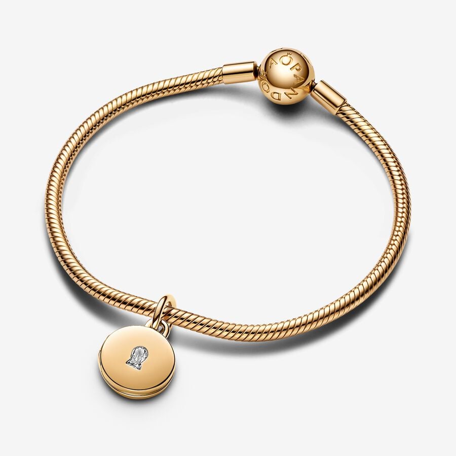 De Pandora Bedel Liefdesmedaillon 763066C01 is een met 14-karaats goud vergulde hanger waarin je een klein aandenken kunt bewaren. De voorkant heeft een sleutelgatvormige zirkonia en de binnenkant is gegraveerd met TODAY TOMORROW ALWAYS. Perfect als symbool van liefde. Verkrijgbaar bij Juwelier van Dam, officiële Pandora-dealer.
