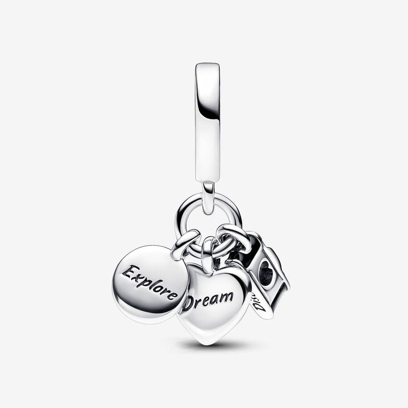 Voor de avonturiers en dromers: de Pandora Camera, Hart & Kompas Driedubbele Hangende Bedel. Dit sterlingzilveren sieraad bestaat uit een camera met een sprankelende zirkonia als lens, een hartvormige wereldkaart met blauw-groen emaille en een kompas met een vaste pijl. De gravures 'Discover', 'Dream' en 'Explore' herinneren je eraan dat het leven een ontdekkingstocht is.