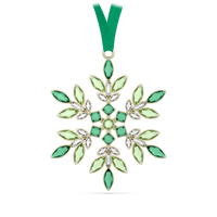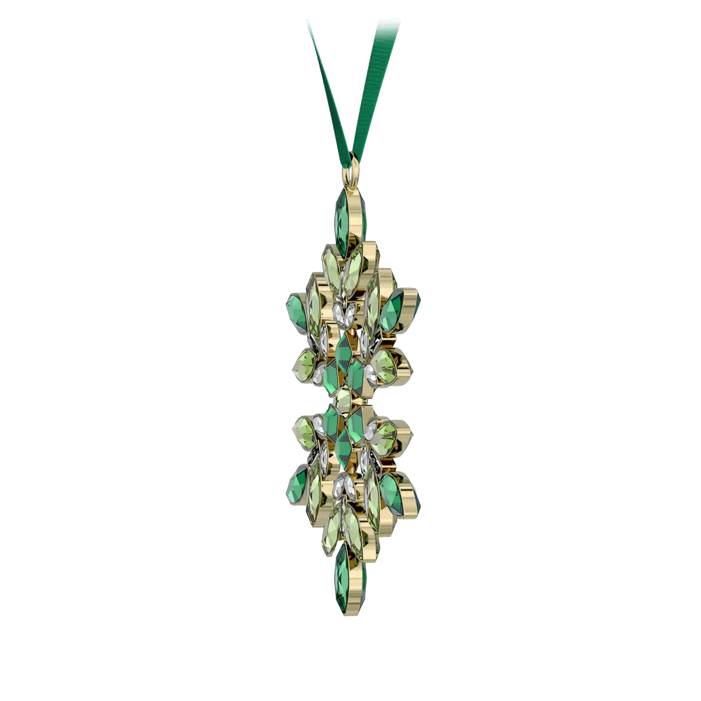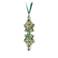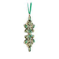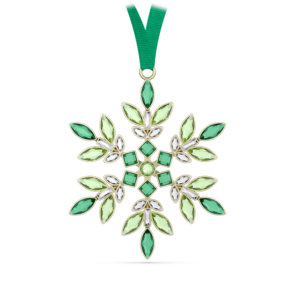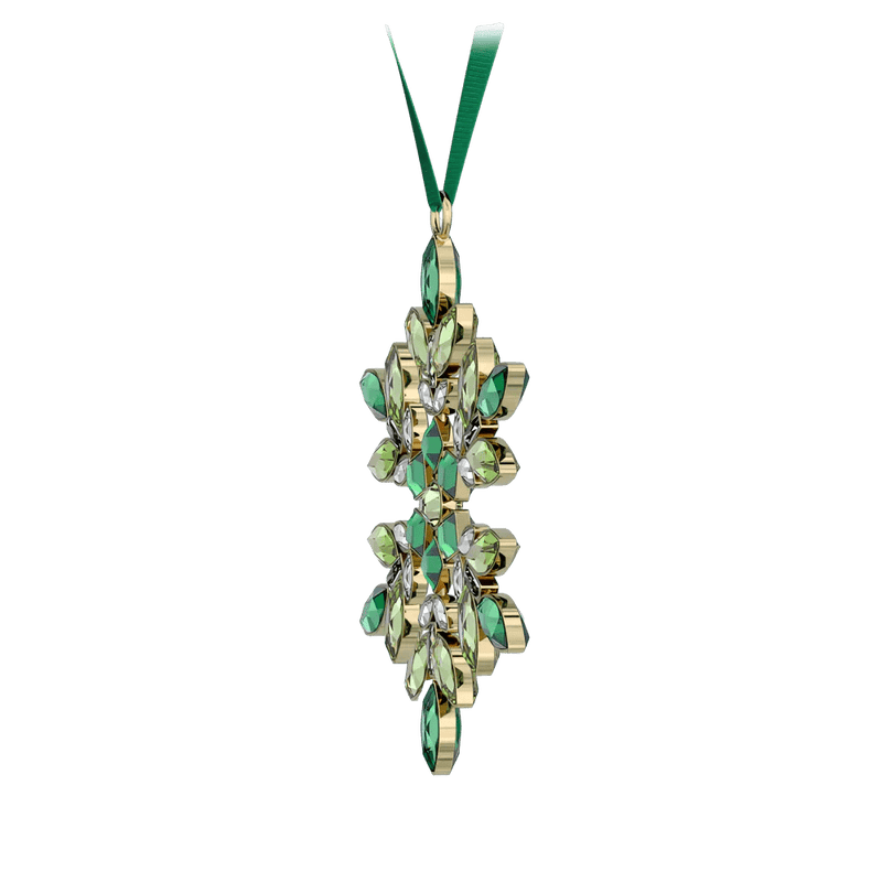 Geïnspireerd door de levendige Gema-familie, wordt de collectie stralende sneeuwvlokornamenten gepresenteerd in Swarovski-merkkleuren met een knipoog naar de feestdagen. Dit Swarovski ornament Gema Kerst Groen 5691044 bestaat uit 86 individuele kristallen in verschillende slijpvormen en tinten, die aan beide zijden zijn aangebracht met behulp van technieken voor het zetten van sierstenen. Het ontwerp hangt aan een groen golvend lint en is afgewerkt met een glanzende goudkleurige finish.