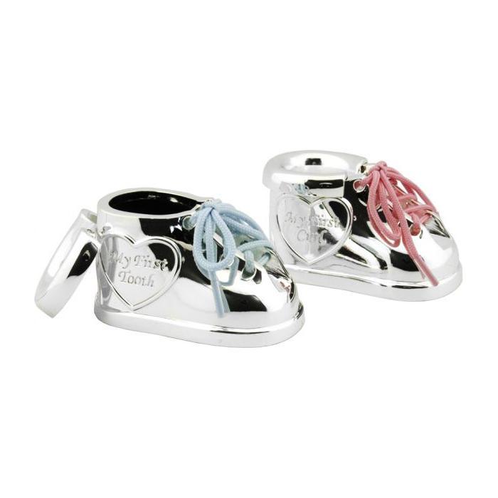 Set van twee tanden- en haarlokdoosjes in de vorm van schoentjes, met roze en blauwe veters. De tanden- en haarlokdoosjes zijn in zilver kleur, poetsen is overbodig. De doosjes kunnen gegraveerd worden, wat het een persoonlijk (geboorte)cadeau maakt.