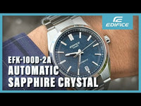 De Casio Edifice EFK‑100D‑2A is een klassiek vormgegeven automatisch horloge met een diepblauwe wijzerplaat en zilverkleurige wijzers en indexen. De combinatie van een zilverkleurige roestvrijstalen kast en band zorgt voor een stijlvolle uitstraling. De kast heeft een diameter van 39 mm en een dikte van 12,5 mm, wat het model zowel tijdloos als comfortabel maakt.