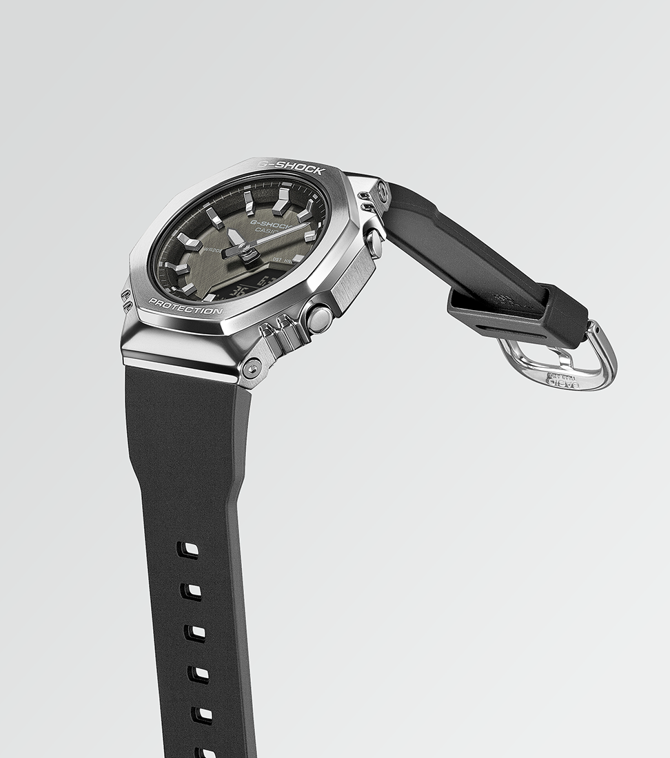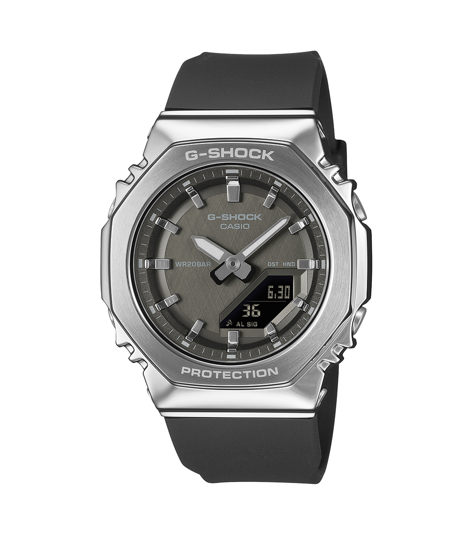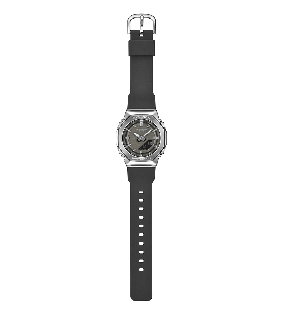 De GM-S2110-1A1ER brengt de iconische G-Shock-vorm naar een compact, elegant formaat dat perfect draagt op smallere polsen. De combinatie van een metalen bezel met een strakke monochrome uitstraling geeft het horloge een luxe, moderne look, terwijl de resin componenten zorgen voor licht draagcomfort en duurzaamheid. De wijzerplaat heeft een verfijnde crosshatch-afwerking en blijft dankzij Neobrite en een dubbele Super Illuminator ook in het donker uitstekend afleesbaar.