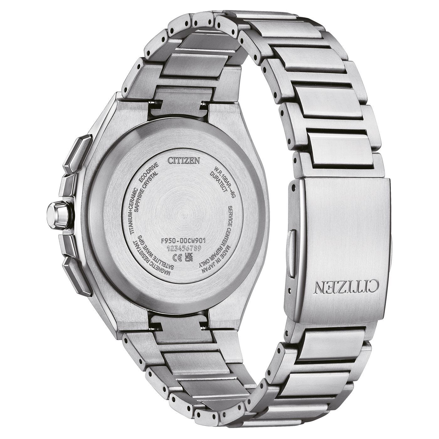 Het horloge is uitgerust met het geavanceerde F950-kaliber, dat wordt aangedreven door Eco-Drive technologie en tot 540 dagen gangreserve biedt na volledige lading. Dankzij GPS-positieherkenning en het Satellite Timekeeping System stemt het horloge zich automatisch af op één van de 39 tijdzones wereldwijd.