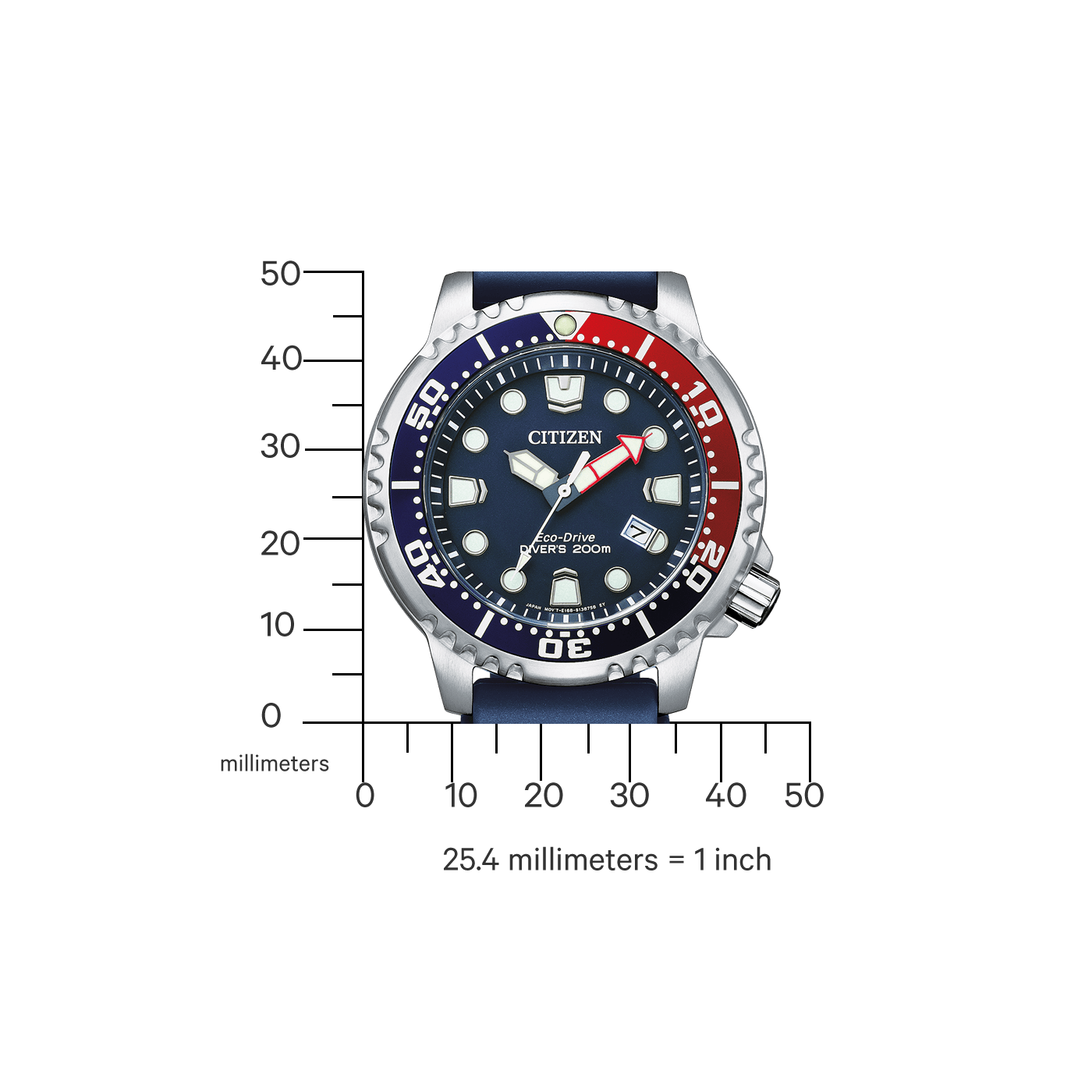 De Citizen ProMaster Marine BN0168-06L is een robuust duikhorloge dat speciaal is ontworpen voor avontuurlijke waterliefhebbers. Dit model, dat deel uitmaakt van de 2023 lente/zomercollectie, heeft een opvallende blauwe wijzerplaat met zilveren, rode en witte wijzers, waardoor het horloge niet alleen functioneel maar ook stijlvol is. Met een kastdiameter van 44 mm en een kastdikte van 11,6 mm is dit horloge ontworpen om zowel duurzaamheid als comfort te bieden. De kast is gemaakt van hoogwaardig roestvrij staal en is uitgerust met een geschroefde achterdeksel, wat bijdraagt aan de waterdichtheid.