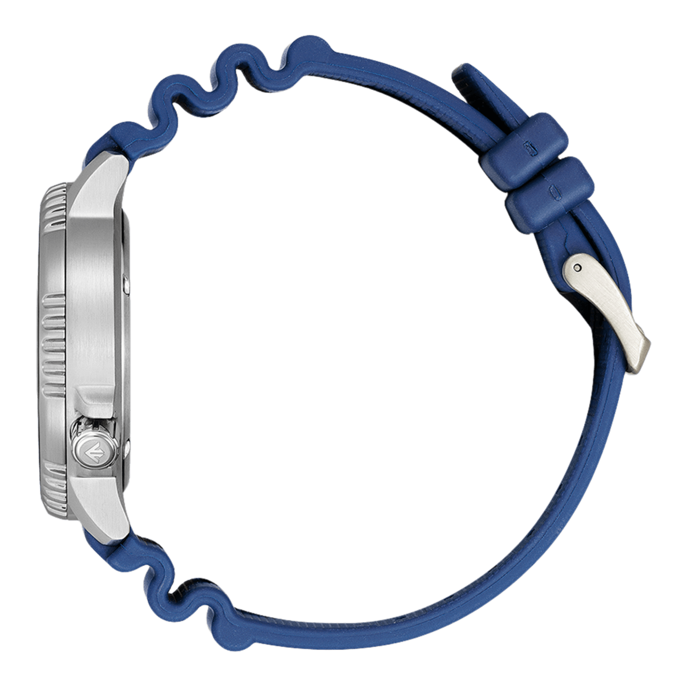 De band is gemaakt van siliconen/rubber, wat zorgt voor een comfortabele en flexibele pasvorm. Met een bandbreedte van 23 mm en een verstelbare sluiting past het horloge om polsen van 160 mm tot 210 mm. De gespsluiting in zilver zorgt voor een veilige en gemakkelijke bevestiging.