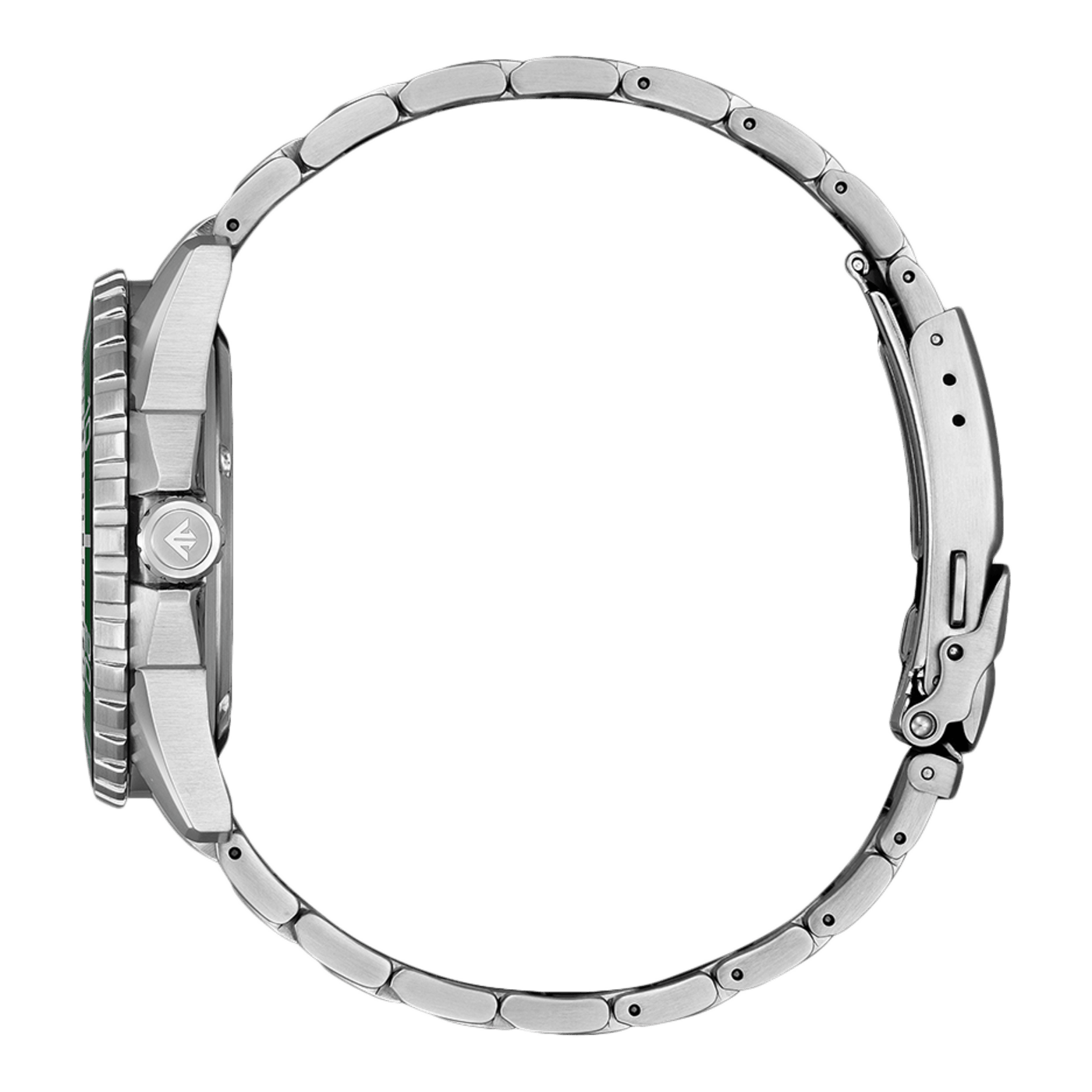 De schakelband van roestvrij staal is uitgerust met een vouwsluiting met drukknoppen en een veiligheidsklep, wat zorgt voor een veilige en comfortabele pasvorm. Met een bandbreedte van 22 mm en een verstelbare sluiting is het horloge geschikt voor polsen met een omtrek van 160 mm tot 210 mm.