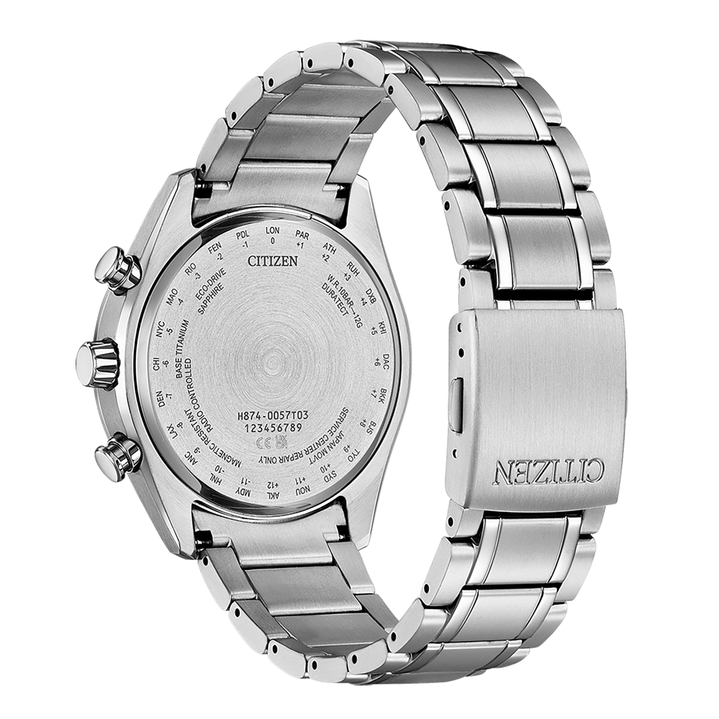 De band is gemaakt van Super Titanium en heeft een breedte van 22 mm, wat zorgt voor een stevige en luxe uitstraling. De vouwsluiting met drukknoppen in zilver biedt extra veiligheid en gebruiksgemak. Dit horloge is geschikt voor polsen met een omtrek van 160 mm tot 220 mm.