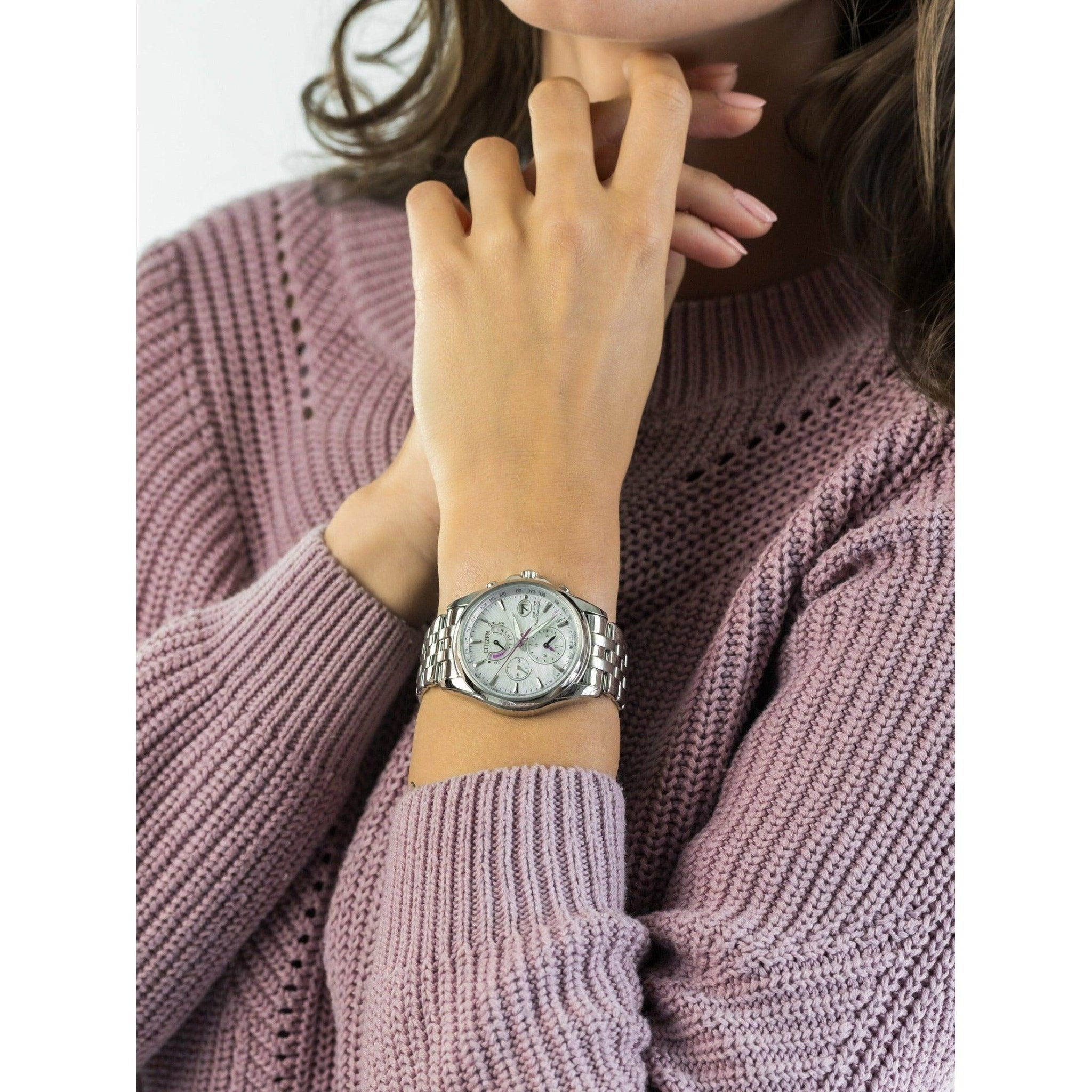 De Citizen Radio Controlled FC0010-55D is een elegant en stijlvol horloge dat zowel functionaliteit als een luxe uitstraling biedt. Gelanceerd in de lente/zomer van 2014, beschikt dit model over een prachtige parelmoer wijzerplaat die een unieke glans geeft en perfect combineert met de zilveren kast en band.