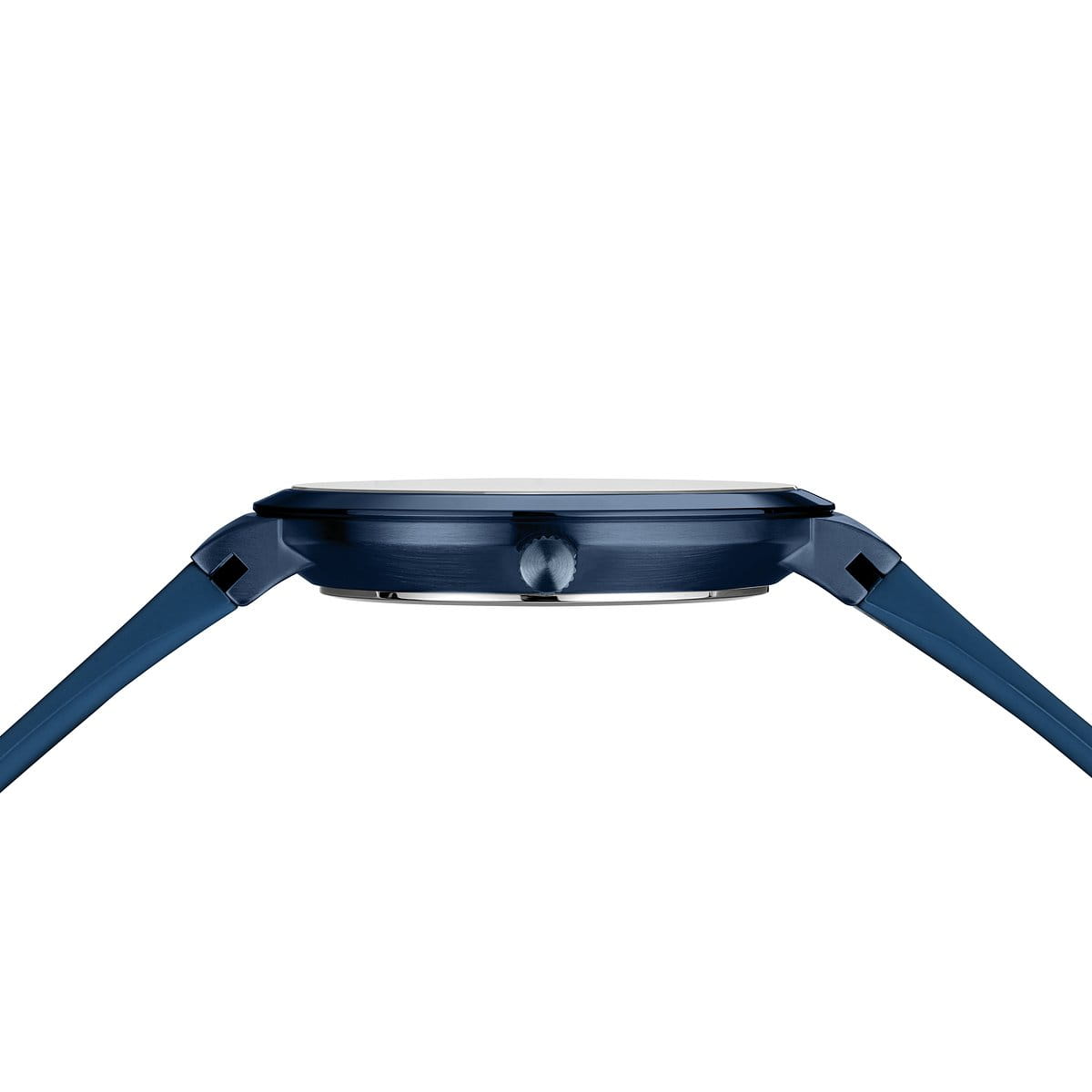 Dit model heeft een blauwe gepolijste roestvrijstalen kast, een siliconen band en een blauwe wijzerplaat. Het platte saffierglas beschermt tegen krassen. Het quartz uurwerk biedt betrouwbare precisie. Waterbestendig tot 3 ATM.