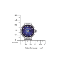 Het horloge heeft een kastdiameter van 29,5 mm en een dikte van slechts 8,3 mm, waardoor het subtiel en elegant om de pols valt. De ronde roestvrijstalen kast en massieve armband in zilverkleur geven het geheel een klassieke look. De blauwe wijzerplaat is voorzien van puntvormige indexen en wordt beschermd door krasbestendig saffierglas.