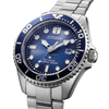 De diepblauwe wijzerplaat wordt beschermd door krasbestendig saffierglas en is voorzien van een datumvenster. De bijpassende blauwe lunette is draaibaar in één richting, perfect voor het meten van duiktijden. De zilverkleurige stalen band sluit met een vouwsluiting met drukknoppen, voor extra veiligheid tijdens het dragen. Het geheel weegt ongeveer 150 gram en draagt comfortabel.