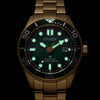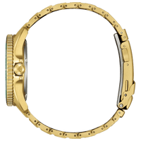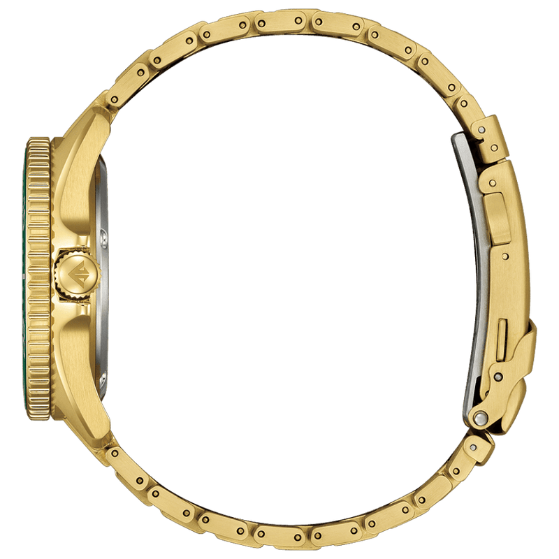 Het horloge beschikt over een 40,6 mm brede en 11,7 mm dikke roestvrijstalen kast met goudkleurige plating. De groene wijzerplaat en lunette zijn stijlvol en functioneel, dankzij de duidelijke markeringen en het krasbestendige saffierglas met antireflectiecoating.