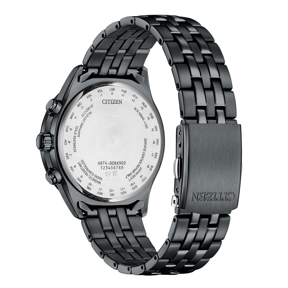 Het hart van dit horloge is het Eco-Drive kaliber H874, dat energie haalt uit licht en een gangreserve van ca. 6 maanden biedt. Dankzij de radio-controlled technologie ontvangt het horloge automatisch de juiste tijd wereldwijd. Bovendien beschikt dit model over een dubbele moonphase-functie (noordelijk/zuidelijk halfrond), een perpetual calendar en wereldtijd voor 24 zones.