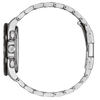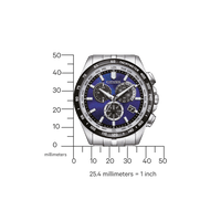 De zilverkleurige kast heeft een diameter van 43 mm en een dikte van 12 mm. De blauwe wijzerplaat is voorzien van streepindexen en wordt beschermd door krasbestendig saffierglas met antireflectiecoating. De horlogeband is gemaakt van massief roestvrij staal en sluit met een vouwsluiting met drukknoppen.