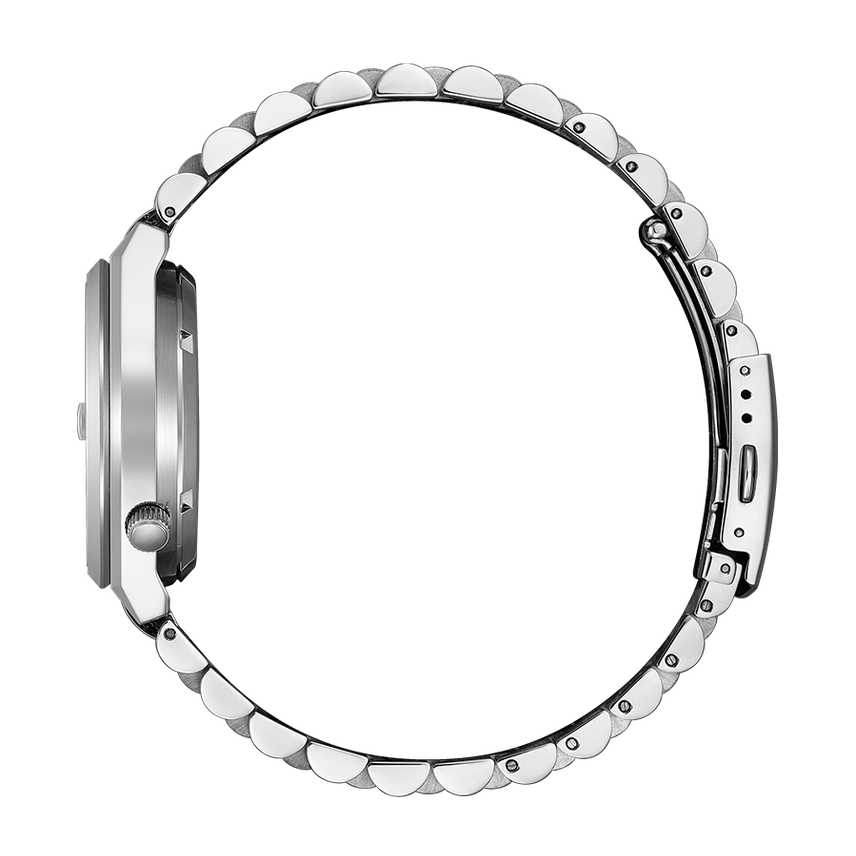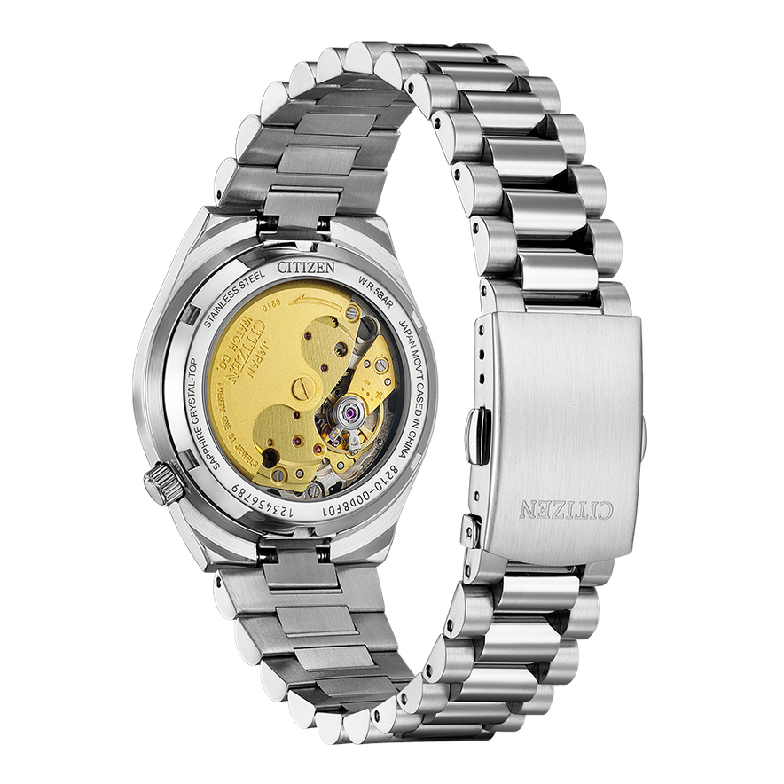 De Citizen NJ0200-50E heeft een roestvrijstalen kast van 37 millimeter breed en 11,5 millimeter dik, met een stijlvolle zwarte wijzerplaat. Het krasbestendige saffierglas beschermt de wijzerplaat, terwijl de roestvrijstalen band met vouwsluiting zorgt voor een moderne en duurzame afwerking.