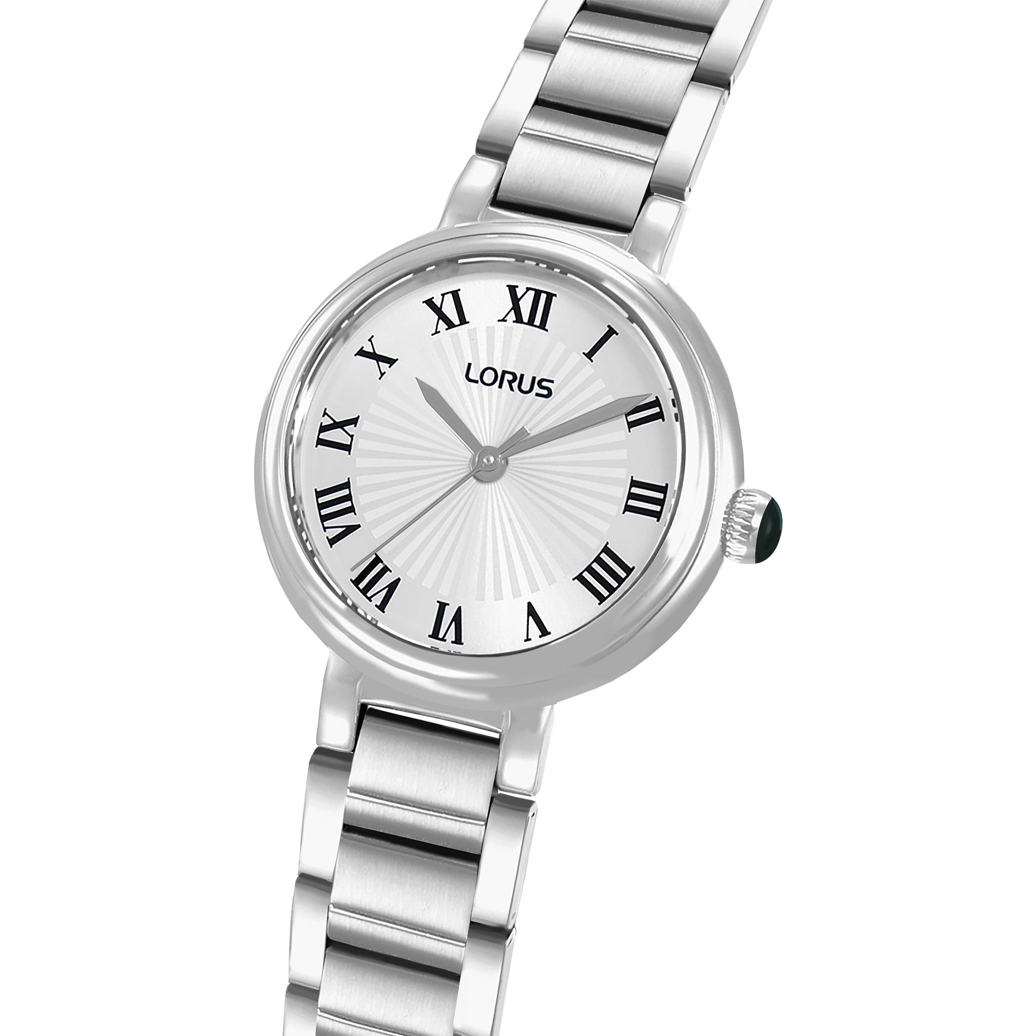 De Lorus RG207YX9 is een stijlvol dameshorloge dat elegantie en eenvoud combineert. Met een kastdiameter van 30 mm en een slanke dikte van 8,3 mm is dit horloge subtiel en comfortabel om dagelijks te dragen. De witte sunray-wijzerplaat geeft een frisse en tijdloze uitstraling, terwijl de zilverkleurige stalen kast en band het geheel een klassieke touch geven.