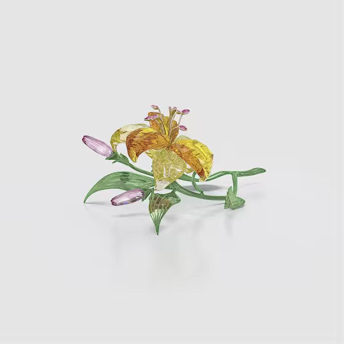 De lelie is al heel lang een symbool van zuiverheid en onschuld. In dit levensgrote eerbetoon heeft Swarovski deze eigenschappen vastgelegd in een betoverende creatie met 633 facetten. Elk detail van de bloem is perfect gevormd met opvallende gele en roze accenten en elegante stelen en bladeren van groen gelakt metaal. Dit horizontale tafereel is vrijstaand en staat prachtig op een mooi gedekte tafel in huis. Er is geen vaas of onderstuk nodig. Decoratief voorwerp. Geen speelgoed. Niet geschikt voor kinderen jonger dan 15 jaar.
