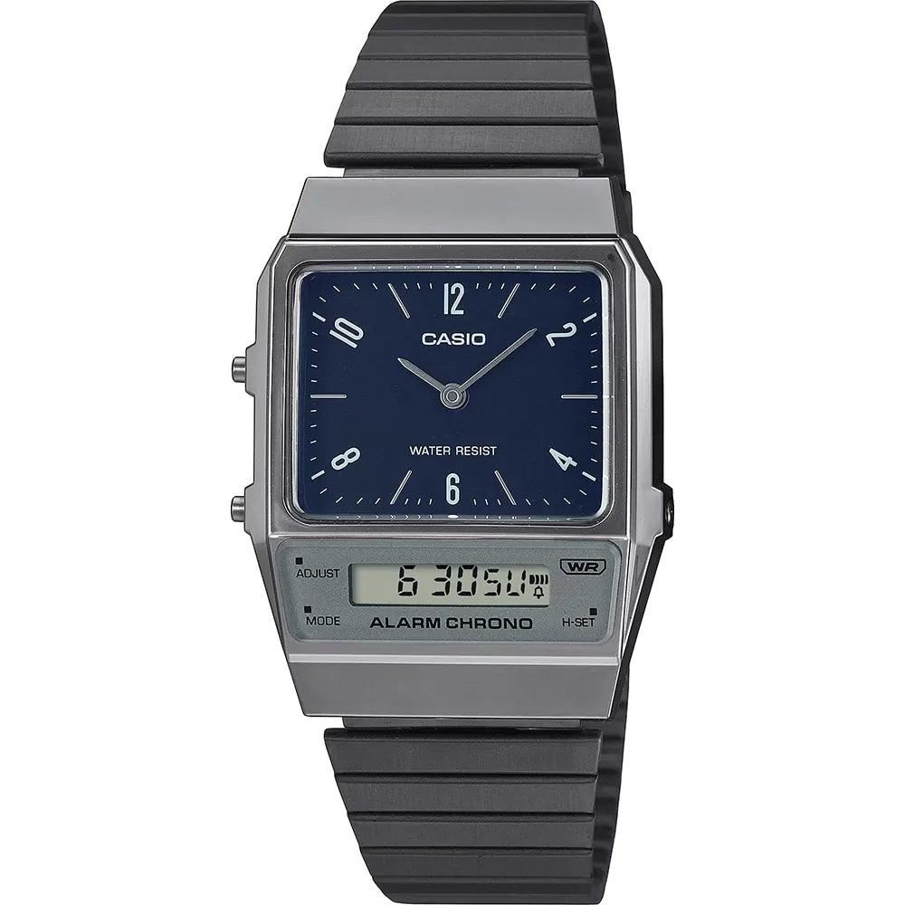 De Casio Vintage AQ-800EB-2AEF is een elegant horloge dat perfect de retro-stijl van de jaren '80 en '90 combineert met moderne functionaliteit. Met afmetingen van 40,7 × 32,1 × 8,7 mm en een gewicht van slechts 52 gram is dit horloge licht en comfortabel om te dragen. De kast is gemaakt van duurzame hars en verchroomd metaal, wat zorgt voor een aantrekkelijke uitstraling en langdurige bescherming tegen krassen. Het harsglas geeft een helder zicht op de wijzerplaat, die een klassieke look heeft met analoge wijzers en een digitaal display.