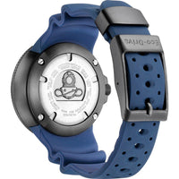 De blauwe siliconen band is comfortabel en duurzaam, met een breedte van 32 mm die zorgt voor een stevige pasvorm op de pols. De band wordt bevestigd met schroeven en is uitgerust met een zwarte gesp, passend bij de robuuste esthetiek van het horloge.