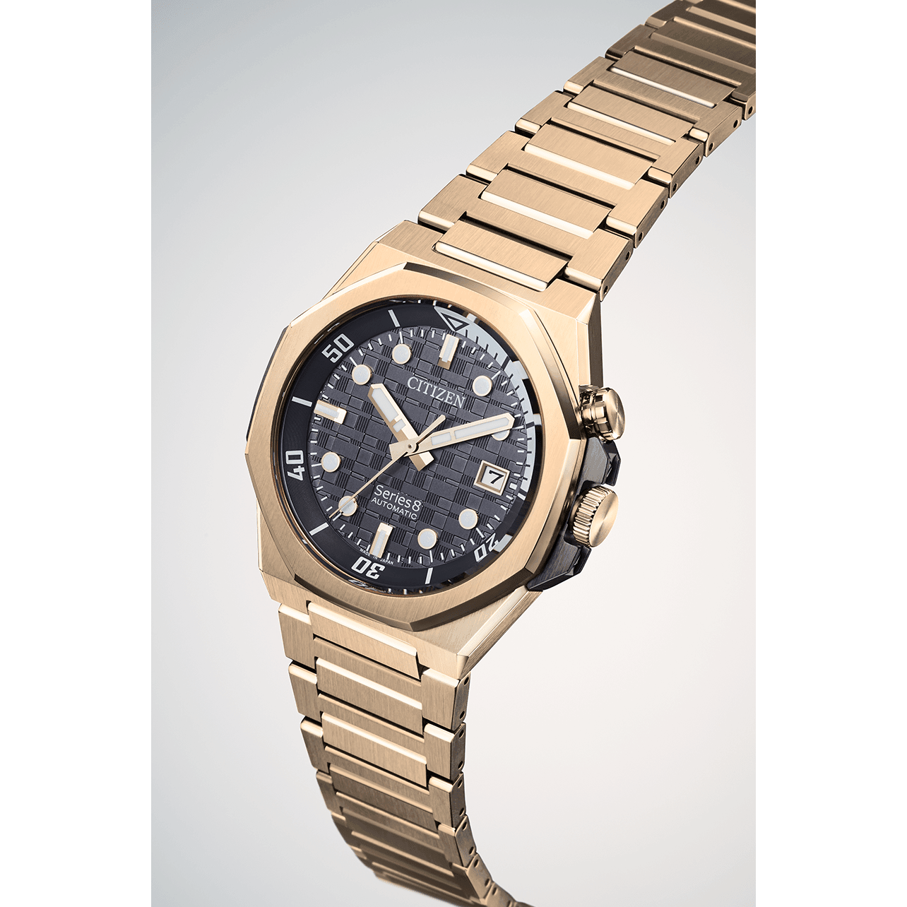 De Citizen Series 8 NB6069-53H is een robuust en elegant horloge, ontworpen voor de moderne man. Met een kast van roestvrijstaal en een roségouden wijzerplaat, biedt dit horloge een verfijnde uitstraling. De grijze wijzerplaat in combinatie met de roségouden wijzers en markeringen zorgen voor een luxe uitstraling, terwijl het saffierglas krasbestendigheid biedt.