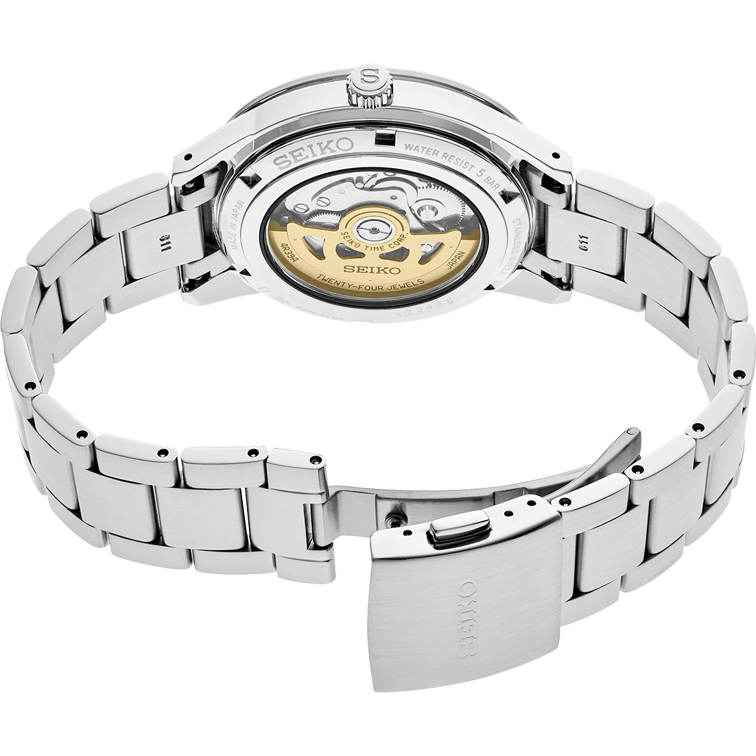 De roestvrijstalen kast heeft een diameter van 41.8 mm en een dikte van 13 mm, waardoor het horloge een robuuste maar elegante uitstraling heeft. Het saffierglas, zowel aan de voorzijde als in de geschroefde achterdeksel, biedt een uitstekende bescherming tegen krassen. Dit horloge is waterbestendig tot 3 bar, wat betekent dat het bestand is tegen lichte waterspatten zoals handen wassen. Het vaste bezelontwerp en de geskeletteerde wijzerplaat bieden een kijkje in het betrouwbare Seiko 4R39 automatische uurwerk, wat de mechanische schoonheid van het horloge benadrukt.