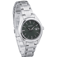 De Seiko Dames SUR533P1 is een elegant en verfijnd horloge dat perfect is voor elke gelegenheid. Dit model uit de 2023 lente/zomercollectie heeft een prachtige groene wijzerplaat met zilveren wijzers, wat zorgt voor een frisse en moderne uitstraling. Met een kastdiameter van 29 mm en een kastdikte van 8,8 mm is dit horloge ideaal voor de vrouwelijke pols en biedt het zowel comfort als stijl. De kast, vervaardigd uit hoogwaardig roestvrij staal, is afgewerkt in zilver en heeft een geschroefde achterdeksel voor extra duurzaamheid en bescherming.