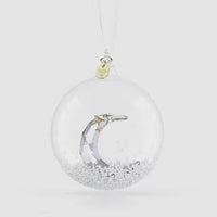 Het Swarovski Annual Edition Ornament Kerstbal voor 2025 is verlicht met een maanachtige gloed, waardoor het een tijdloos geschenk is om dierbaren te geven. De glinsterende glazen bal is gedecoreerd met ongeveer 2200 kristallen en hangt aan een wit ripsband lint met een hanger met champagnegoudkleurige toplaag, gegraveerd met het jaar 2025. Binnenin bevindt zich een serene halve maan, versierd met goudkleurige sterren en met 158 precisiegeslepen facetten. Dit Annual Edition Ornament Kerstbal is ideaal om een verjaardag, bruiloft of jubileum luister bij te zetten. Decoratieobject. Geen speelgoed. Niet geschikt voor kinderen jonger dan 15 jaar.