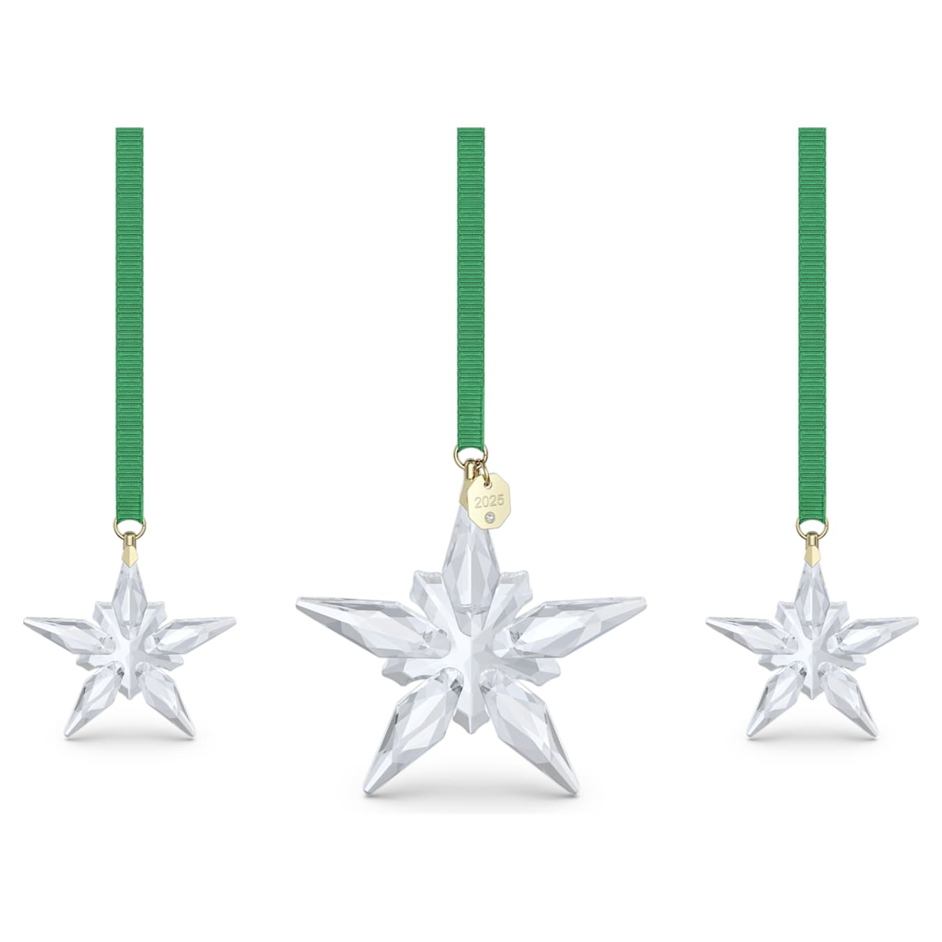Deze magische set voor de feestdagen zet de iconische traditie van Swarovski’s Annual Edition Ornamenten voort. De set bestaat uit drie heldere sterren, vervaardigd met in totaal 570 facetten, die zijn geïnspireerd door de sereniteit van de nachtelijke hemel. Elke ster hangt aan een groen ripsband lint met accenten met een champagnegoudkleurige toplaag, terwijl op het label van de grote ster ook een gravure van het jaar 2025 staat. Deze aandenkenset, speciaal ontworpen voor de feestdagen, is een elegant cadeau of een pronkstuk in uw eigen feestelijke inrichting. Decoratieobject. Geen speelgoed. Niet geschikt voor kinderen jonger dan 15 jaar.
